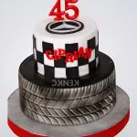 Этот торт – настоящая автомобильная мечта! Двухъярусный круглый торт полностью покрыт гладкой мастикой, имитирующей блестящий кузов серебристого Мерседеса. На верхнем ярусе – узнаваемый логотип марки, а нижний украшен стилизованными колесами. Серебристые и черные акценты создают эффект хромированных деталей. Торт выглядит как миниатюрная копия роскошного автомобиля – сдержанно, стильно и по-мужски элегантно.