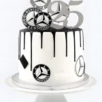 На белоснежном круглом торте красуется реалистичное изображение эмблемы Mercedes-Benz. Серебристая звезда в лавровом венке выглядит элегантно и строго. Лаконичный дизайн подчеркивает статусность тематики, создавая ощущение торжественности. Четкие линии и сдержанная цветовая гамма передают дух автомобильной классики.