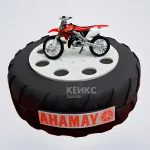 Торт в виде колеса с фигуркой мотоцикла и логотипом