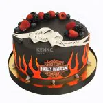 Этот торт создан для настоящих ценителей скорости и свободы. На гладкой мастике эффектно изображен стильный мотоцикл в динамике, словно застывший в момент движения. Сочетание глубокого черного и ярко-красного цветов придает торту брутальный и энергичный вид. Сочные ягоды добавляют контрастные акценты, напоминая о страсти к приключениям. Минималистичный дизайн с четкими линиями передает дух дороги и адреналина.