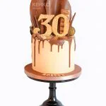 Этот торт — настоящая визуальная симфония в глубоких синих тонах с золотыми акцентами. Круглая форма подчеркивает элегантность композиции, а гладкая мастика создает эффект бархатистой поверхности. Центральным элементом становятся объемные цифры, покрытые мерцающей карамельной глазурью, которая переливается на свету. Золотые брызги и геометрические узоры добавляют торту современный шик, делая его похожим на произведение кондитерского искусства. Сине-золотая палитра вызывает ассоциации с ночным небом, усыпанным звездами.