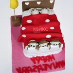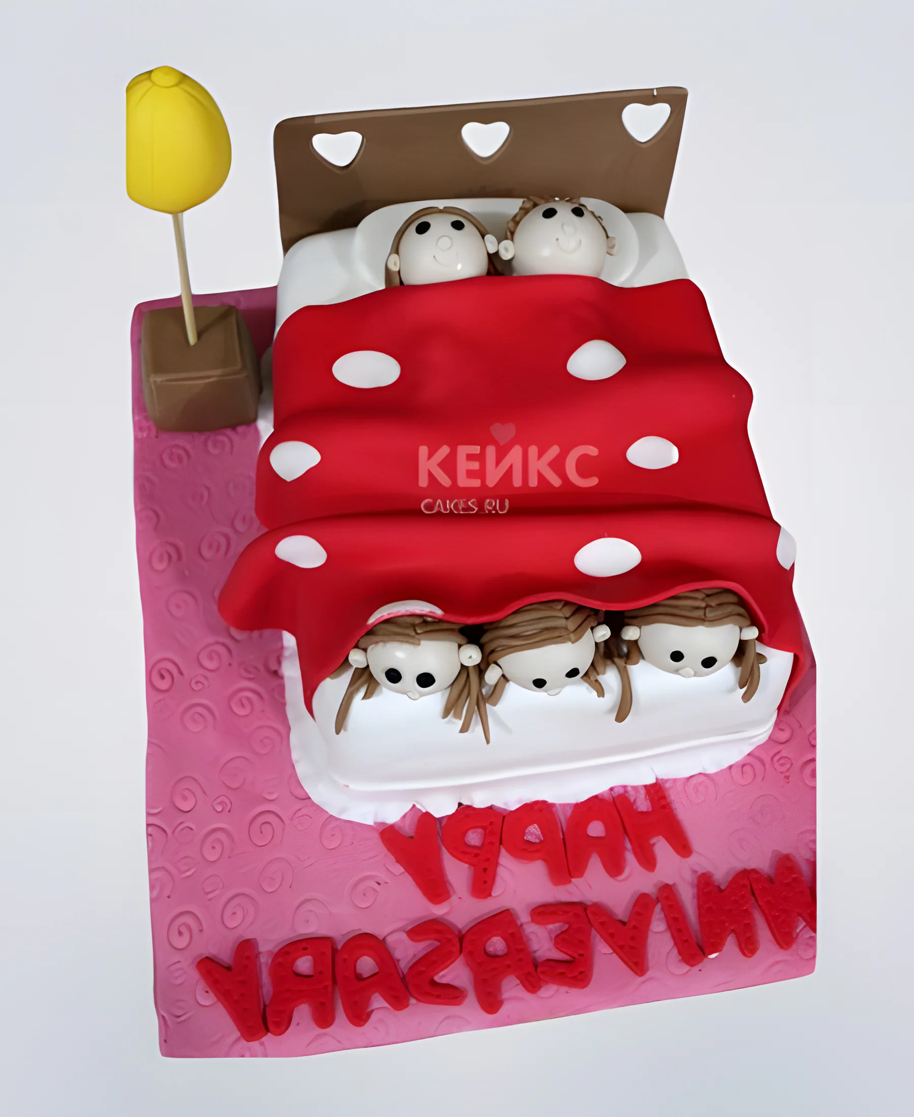 Торт в виде кровати с красным одеялом и фигурками жениха и невесты