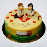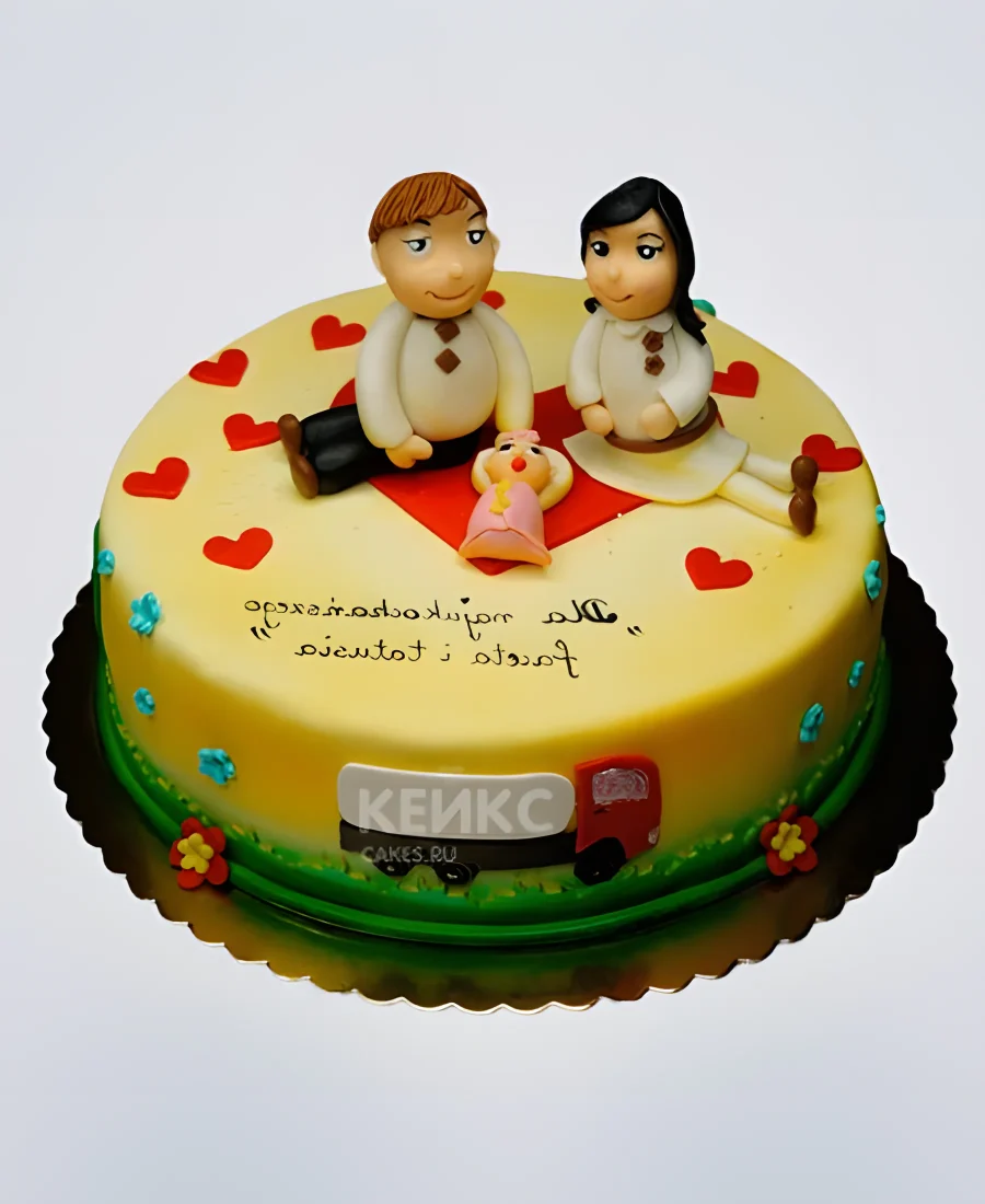 Желтый торт с влюбленными и сердечками