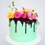 Нежный мятный торт с шоколадной глазурью выглядит свежо и элегантно. Его гладкая поверхность украшена тонкими линиями белого крема, создающими эффект мраморного узора. По краю торта — россыпь хрустящих шоколадных шариков, добавляющих текстуру. В центре — композиция из белых и розовых цветов, которые придают торту романтичное настроение. Сочетание зелёного, белого и шоколадного оттенков делает его визуально притягательным и стильным.