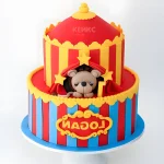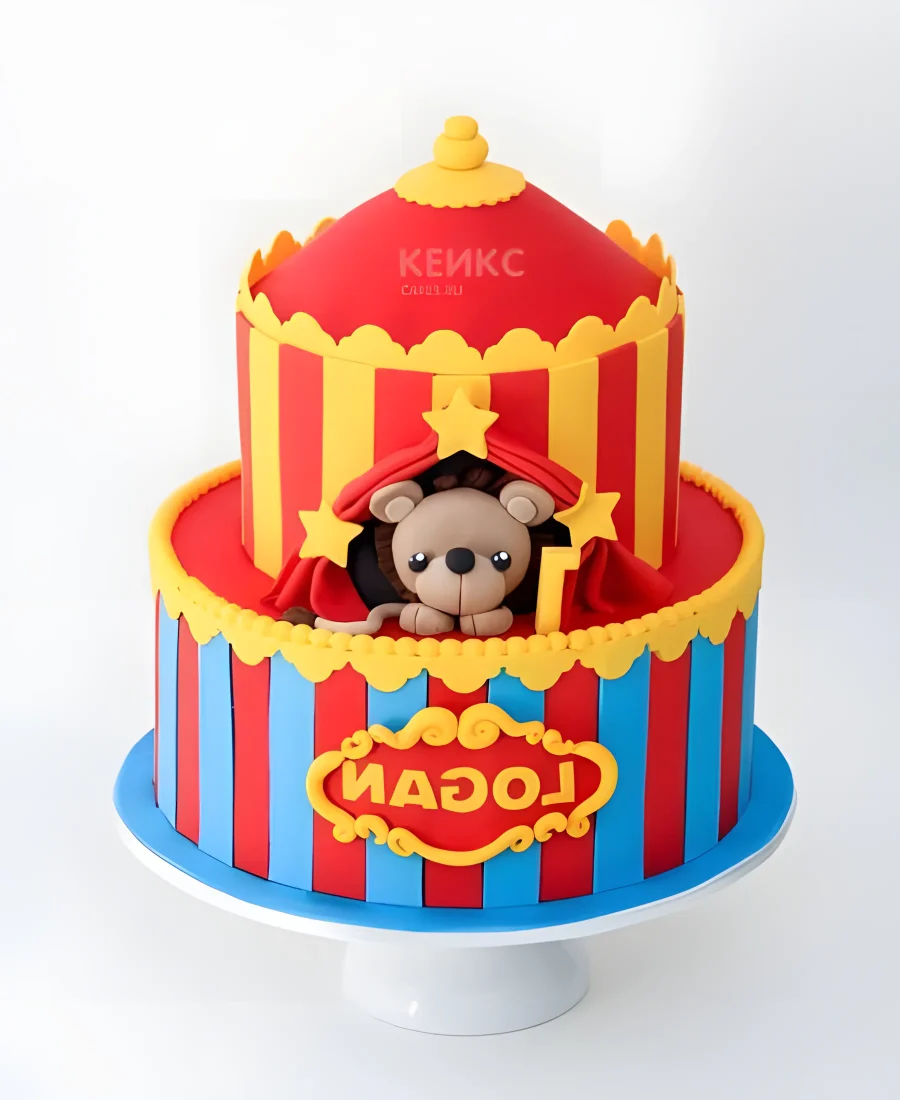 Красно-синий торт с мишкой в виде цирка