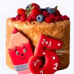 Яркий школьный торт с фотопечатью сразу создает праздничное настроение. На белом креме изображены веселые карандаши и тетрадный лист с пятеркой – символ отличного старта учебного года. Красные и желтые акценты добавляют торту динамики, а реалистичные детали в виде школьных принадлежностей делают его тематическим и запоминающимся. Такой торт станет центром внимания на любом празднике, посвященном Дню знаний.