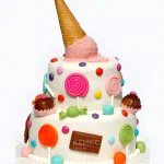 Этот яркий двухъярусный торт словно сошел со страниц сказочной книги! Нижний ярус украшен аппетитными конфетами и печеньем, будто рассыпанными по нежно-розовой мастике. Верхний ярус венчает эффектное перевернутое мороженое с вишней — игривый и неожиданный элемент. Сочетание пастельных оттенков и сочных акцентов создает праздничное настроение, а обилие сладких деталей делает торт по-настоящему волшебным.