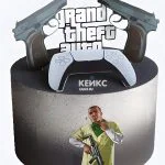 Этот торт — настоящая визуальная отсылка к культовой игре GTA. Круглая форма с яркой фотопечатью на мастике сразу привлекает внимание. Черно-красная цветовая гамма и узнаваемые элементы создают атмосферу динамичного приключения. Торт выглядит стильно и современно, словно перенося в мир виртуальных гонок и свободы. Лаконичный одноярусный дизайн подчеркивает четкость изображения, делая его центральным элементом композиции.