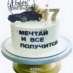 Этот торт — настоящая визуальная история для именинника. На гладкой мастике синего и черного цветов эффектно выделяется фотопечать с изображением стильного автомобиля, а объемная цифра «17» добавляет динамики. Контрастные белые детали и серебристые акценты подчеркивают современный и брутальный стиль. Торт выглядит как мини-арт-объект, передающий дух скорости и юношеской энергии.