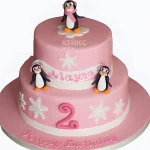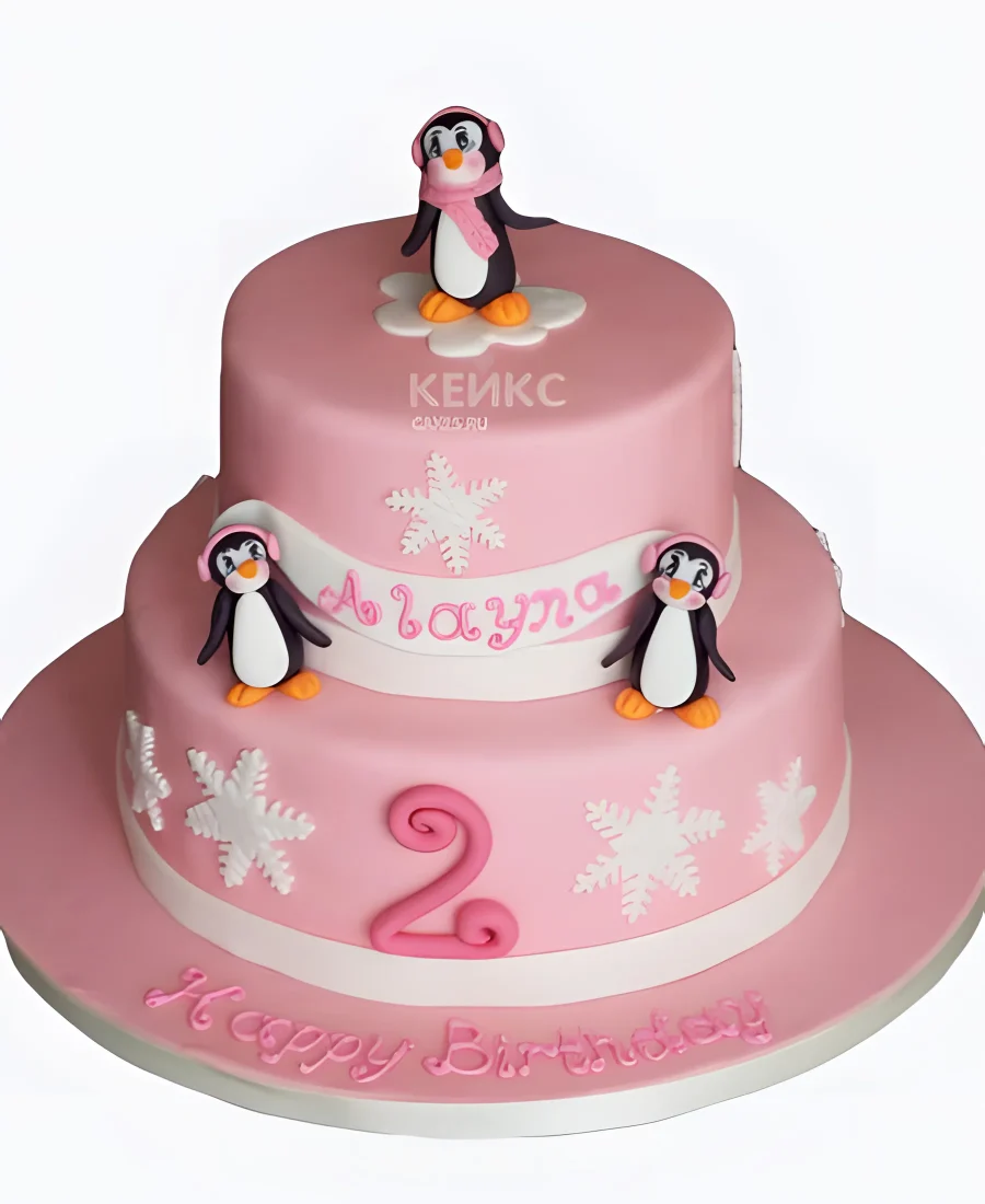 Розовый торт с пингвинами и снежинками
