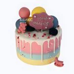 Нежный розовый торт с воздушными кремовыми рюшами по краям создаёт атмосферу сказки. Украшен милыми сахарными мишками, которые будто только что вышли из волшебного леса. Яркие контрастные шарики добавляют праздничного настроения, а золотистые акценты делают торт по-настоящему нарядным. Лёгкие пастельные тона и округлые формы вызывают умиление, идеально передавая трогательность момента.