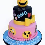 Яркий двухъярусный торт в нежных пастельных тонах. Верхний ярус украшен веселыми смайликами с забавными надписями, создающими игривое настроение. Центральным элементом стал объемный желтый бант с изящными складками, добавляющий торжественности. Сочетание розового, сиреневого и желтого создает радостную цветовую палитру. Торт излучает детскую непосредственность и праздничное настроение.