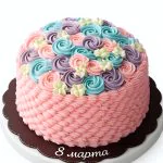 Отпразднуйте Международный женский день с этим красочным и вкусным тортом! В оформлении использованы маленькие и нежные цветы, пионы пастельных оттенков! Верх торта украшен цветочным декором, а также множеством ягод и маленьких цветов.