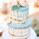 Нежный бирюзовый торт с воздушными кремовыми рюшами создаёт ощущение лёгкости и праздника. Два яруса украшены изящными сахарными цветами пастельных оттенков, которые переливаются под светом. Серебристые акценты и тонкие узоры добавляют торту свадебной элегантности. Композиция выглядит как воплощение нежности и романтики.