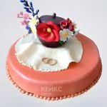 Элегантный круглый торт, покрытый гладкой мастикой нежного оттенка. Украшен изящными фигурками и декоративными элементами, выполненными вручную. Центральное место занимают стилизованные кольца из мастики, символизирующие крепкий союз. Лаконичный и утонченный дизайн делает этот торт идеальным для празднования чугунной свадьбы.