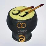 Этот оригинальный торт выполнен в виде чугунной сковороды с крышкой, что делает его идеальным для празднования чугунной свадьбы. Круглая форма торта покрыта гладкой мастикой, имитирующей металлическую поверхность. Декор включает миниатюрные фигурки повара и кухонной утвари, которые добавляют торту игривости и тематической завершенности. Одноярусный дизайн подчеркивает лаконичность и стиль этого необычного кондитерского изделия.