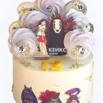 Этот торт — настоящая магия в духе аниме «Унесённые призраками»! На белоснежной мастике оживают любимые персонажи: задумчивая Тихиро и загадочный Хаку. Яркие леденцы и воздушное безе добавляют праздничного настроения, а нежные пастельные оттенки создают атмосферу волшебства. Каждая деталь продумана — от изящных узоров до точной прорисовки героев. Такой торт словно переносит в таинственный мир духов, где каждый кусочек — это маленькое приключение.