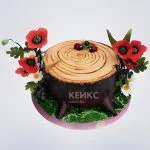 Круглый торт в нежных пастельных тонах с изящными маками из мастики. Роскошные цветы создают романтичное настроение, а золотистые акценты добавляют торжественности. Композиция напоминает о тепле семейного очага и природной гармонии. Элегантная простота исполнения подчеркивает особую атмосферу деревянной свадьбы.