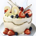 Этот элегантный свадебный торт выполнен в нежных пастельных тонах, напоминающих переливы фарфора. Белоснежная глазурь создаёт эффект драгоценного фарфорового изделия, а тонкие золотые акценты добавляют торту роскоши. Центральным элементом становится изящная цифра «20», выполненная в той же золотой гамме. Свежие ягоды, разложенные у основания, придают композиции лёгкость и свежесть. Торт выглядит одновременно хрупким и монументальным, как символ двадцати лет крепкого союза.