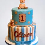 Этот двухъярусный торт в нежных голубых тонах выглядит по-настоящему празднично. Верхний ярус украшен забавными фигурками медвежат, которые создают трогательную атмосферу. Нижний ярус обрамляет элегантный белый бант, добавляя торту нотки изысканности. Матовое мастичное покрытие придает поверхности бархатистый вид, а пастельные оттенки голубого создают ощущение воздушности. Простые, но выразительные детали делают этот торт милым и запоминающимся.
