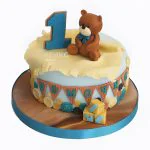 Милый круглый торт в нежных голубых тонах украшен объемными белыми пуговицами и забавным мишкой. Лаконичный дизайн создает трогательную атмосферу детского праздника. Белоснежные акценты гармонично сочетаются с пастельной палитрой, вызывая улыбку и ощущение нежности.