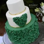 Этот роскошный трехъярусный торт в изумрудных тонах создает ощущение настоящего праздника. Нежные рюши из мастики, расположенные волнами, напоминают переливы шелка. Золотистые акценты добавляют торту благородный блеск, а изящные детали подчеркивают торжественность момента. Игра фактур и глубина оттенков зеленого превращают десерт в настоящее произведение искусства, которое станет центром внимания на любом мероприятии.