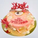 Розовый торт на коралловую свадьбу с жемчугом и ракушками
