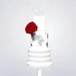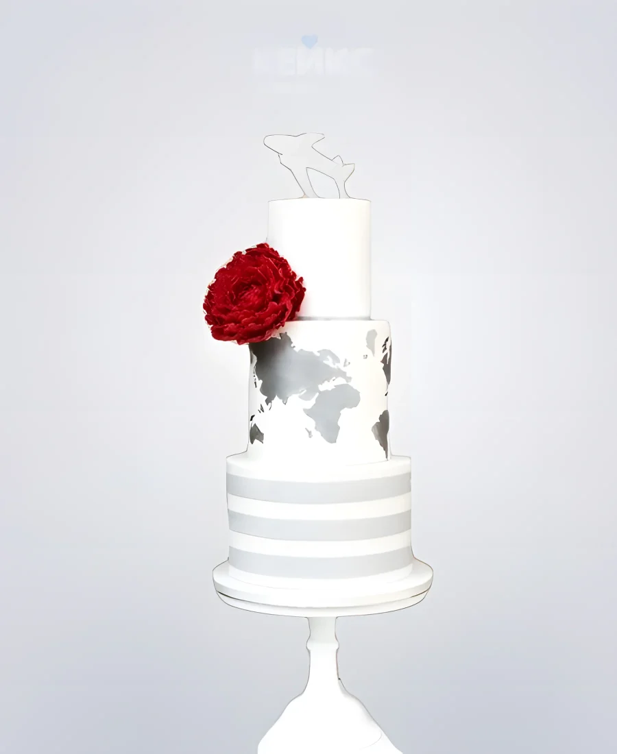 Высокий белый торт на корпоратив с картой мира и красным цветком