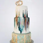 Этот торт приковывает взгляд своим современным геометрическим дизайном. Четкие линии и контрастные узоры создают эффект оптической иллюзии, напоминая абстрактное искусство. Многоуровневая конструкция с асимметричными элементами выглядит динамично и смело. Сочетание глубокого синего и белого цветов добавляет торту графичности и стиля. Такой десерт станет ярким акцентом любого праздничного мероприятия.