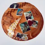 Этот элегантный круглый торт в шоколадных тонах создан для кожанной свадьбы. Гладкая матовая мастика напоминает фактуру кожи, а черно-белые фотографии, словно страницы альбома, рассказывают историю пары. Контраст глубокого коричневого с золотистыми акцентами придает торту благородный вид. Минималистичный декор подчеркивает значимость каждого снимка, превращая торт в трогательную летопись отношений.