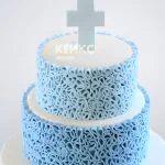 Элегантный двухъярусный торт в нежных голубых тонах, украшенный кружевными узорами из мастики. Идеальный вариант для торжества в честь крещения мальчика. Круглая форма и изысканный дизайн делают этот торт настоящим украшением праздника.