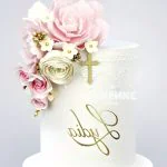 Элегантный круглый торт в белоснежной мастике с нежными цветочными украшениями. Центральным элементом декора служит фигурка ангела и крест, выполненные в тонкой золотой отделке. Минималистичный дизайн подчеркивает торжественность момента. Идеальный вариант для крестин или религиозных праздников.