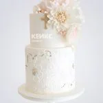 Элегантный двухъярусный торт круглой формы, украшенный белоснежной мастикой. Верхний ярус декорирован нежными цветами и листьями, создающими романтичное настроение. Нижний ярус оформлен в классическом стиле с гладкой поверхностью и тонкими золотистыми деталями. Идеальный выбор для торжественного случая, сочетающий в себе изысканность и утонченность.