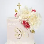 Элегантный круглый торт в нежных пастельных тонах, украшенный изящными кружевными элементами и декоративными цветами кораллово-белого оттенка. Покрытие из гладкой мастики придает торту утонченный и стильный вид. Идеальный выбор для крестин девочки – нежный, воздушный и очень торжественный.
