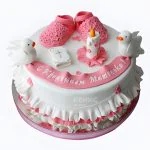 Нежный торт в пастельных тонах создан для особенного события — крещения девочки. Основной акцент сделан на изящной бело-розовой гамме с золотистыми деталями. Торт украшен воздушными рюшами, цветами и жемчужными бусинами, что придает ему трогательную утонченность. Надпись с именем и датой добавляет торту индивидуальности, превращая его в памятный элемент праздника. Лаконичная круглая форма подчеркивает элегантность декора.