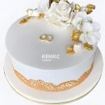 Торт на льняную свадьбу с цветами и кольцами с золотой отделкой