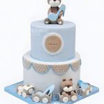 Нежный голубой торт с двумя ярусами украшен воздушными облаками и золотистыми звездами. На верхнем ярусе красуется цифра «6», окруженная милыми плюшевыми мишками. Сочные оттенки синего и белого создают атмосферу сказочного неба, а серебристые акценты добавляют торжественности. Этот торт словно переносит в мир детских грез и волшебных сновидений.