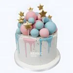 Нежный круглый торт в пастельных тонах создает трогательную атмосферу ожидания чуда. Голубые и розовые элементы гармонично переплетаются, символизируя таинство рождения. Милые пинетки и облачка из крема добавляют трогательные детали, а воздушная текстура покрытия напоминает мягкие пеленки. Каждый элемент композиции излучает теплоту и нежность, создавая праздничное настроение для этого особенного события.
