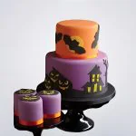 Оранжево-фиолетовый торт с тыквами и летучими мышами на Хэллоуин