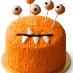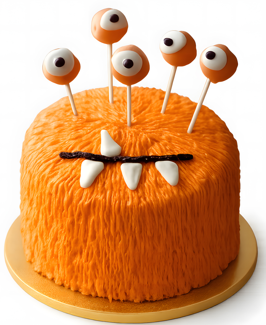 Этот круглый торт — настоящее воплощение духа Хэллоуина. Он полностью покрыт яркой оранжевой мастикой, создавая эффект пухлой, почти живой кожи. Центральным элементом служит забавная мордочка монстра: большие белые глаза с черными зрачками и широкая улыбка, полкая острых зубов. Простая, но выразительная лепка придает персонажу озорной и совсем не страшный характер. Цветовая гамма строится на контрасте сочного оранжевого, глубокого черного и чистого белого, что делает торт очень графичным и заметным. Общее настроение — игривое и праздничное, идеально подходящее для вечеринки.
