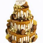 Трехъярусный круглый торт в нежных пастельных тонах создает праздничное настроение. Белоснежная мастика украшена золотистыми акцентами и россыпью конфет, которые переливаются на свету. Элегантные геометрические узоры и цифра «35» в золотом обрамлении подчеркивают юбилейную тематику. Каждый ярус демонстрирует тонкую работу кондитера, создавая впечатление настоящего произведения искусства.