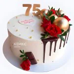 Этот элегантный круглый торт создан для особого юбилея. Его белоснежное кремовое покрытие служит идеальным фоном для роскошных красных роз, которые словно только что сорваны с садовой клумбы. Цветы расположены с изящной небрежностью, создавая ощущение естественной красоты. Торт украшен тонкой аппликацией, добавляющей торжественности и завершенности образу. Красные розы на фоне белого крема выглядят особенно выразительно, напоминая о любви и уважении.