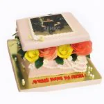 Нежный квадратный торт в виде изящной розовой коробки с приоткрытой крышкой. На боковых гранях – трогательные фото с мамой и детьми в кружевных рамках. Из коробки эффектно высыпаются реалистичные розовые и белые цветы с зелёными листьями. Романтичная пастельная гамма и трогательные детали создают тёплую семейную атмосферу.