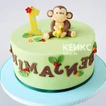 Этот яркий круглый торт покрыт гладкой зеленой мастикой, создающей эффектную основу для декора. Главным украшением служит забавная фигурка обезьянки, дополненная бананами, которые придают торту игривый и динамичный вид. Простой одноярусный дизайн делает торт лаконичным, но запоминающимся, идеально подходящим для детского праздника или тематического мероприятия.