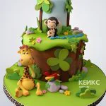Этот двухъярусный круглый торт украшен яркой мастикой и забавными фигурками обезьянки и жирафа. Декор выполнен с большой детализацией, создавая игривую и праздничную атмосферу. Торт идеально подойдет для детского праздника или тематического мероприятия.