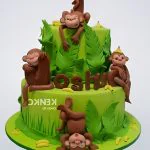 Яркий двухъярусный торт круглой формы, полностью покрытый гладкой зеленой мастикой. Главный акцент декора — забавные фигурки обезьянок, которые украшают верхний и нижний ярусы. Торт выглядит очень празднично и необычно благодаря насыщенному цвету и оригинальному оформлению. Идеально подойдет для детского дня рождения или тематического мероприятия.