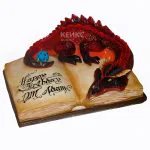 Потрясающий 3D-торт в виде раскрытой книги, где главный герой — величественный красный дракон. Фантастическое существо с детализированной чешуей и крыльями будто оживает на страницах. Глубокий красный цвет дракона контрастирует с кремовыми «бумажными» страницами и темным переплетом. Создается полное ощущение, что перед тобой магический фолиант, из которого вот-вот выпорхнет мифический страж. Каждый элемент — от тиснения на обложке до складок на страницах — проработан с невероятной точностью.