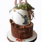 Этот юбилейный торт создан в стилистике охотничьей тематики. Насыщенная коричневая палитра с золотистыми акцентами напоминает осенний лес. По бортику расположены изящные веточки с листьями, создающие ощущение единения с природой. Центральная композиция с охотничьими атрибутами и поздравительной надписью добавляет торту особого шарма и индивидуальности.