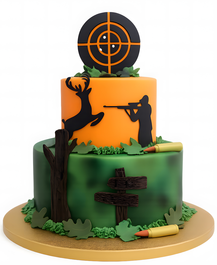 На двухъярусном торте изображена классическая мишень с концентрическими кругами ярко-красного и чёрного цветов. Строгий дизайн передаёт атмосферу спортивной точности и сосредоточенности. Лаконичные детали создают ощущение элегантности и стиля, напоминая о духе соревнований.