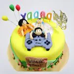 Желтый торт с фигурками и воздушными шарами